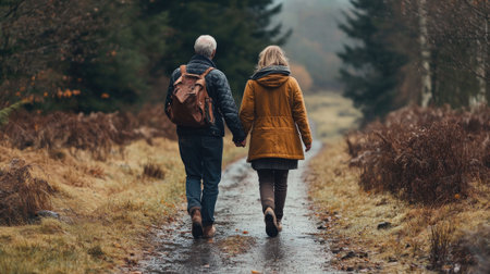 Senior couple holding hands is enjoying a walk together on a muddy path in the woods