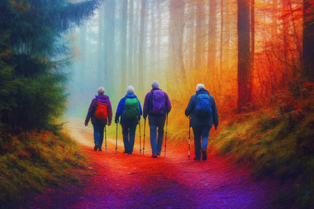 A group of elderly hikers strolls along a vibrant, misty forest path, experiencing the beauty of nature.
