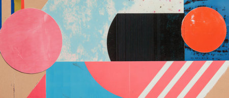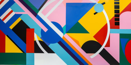 This vibrant image features a striking arrangement of geometric shapes in various colors on a bold split background, perfect for artistic themes and modern design projects.