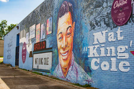 Montgomery, Alabama, USA - May 27, 2021: Nat King Cole mural at 435 Maxewell Blvd. by local artists Sunny Paulk and Corey Spearman. Nat King Cole, a famous musician and actor, was born in Montgomery in 1919. He was the first African-American to host a tv