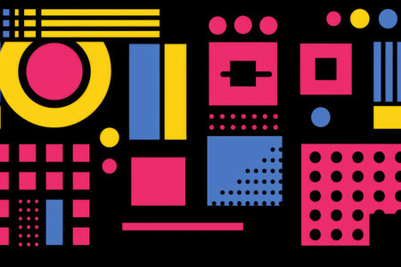 A colorful, neon background with a series of yellow and pink lines and shapes. The background is a mix of squares and circles