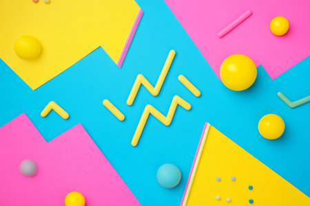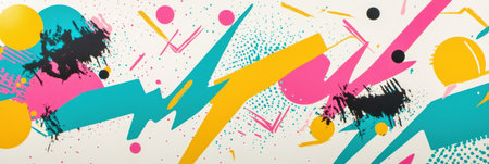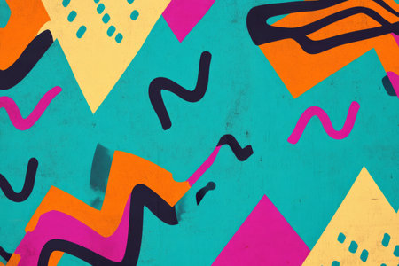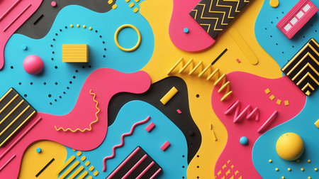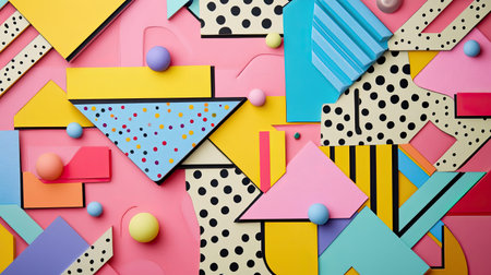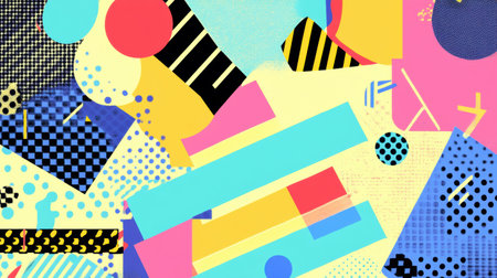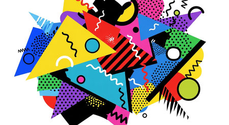 Memphis-style art showcases abstract shapes like zigzags and dots, set against a colorful, dynamic background with playful patterns.