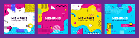 Square cover background, Memphis abstract geometric design. Vector playful cards or story posts modern templates, feature vibrant colors, simple shapes and patterns in retro-modern style of the 1980s
