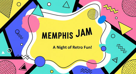 This vibrant abstract background a playful 1980s aesthetic with bold geometric shapes and a bright color palette. The central area is a yellow, wavy-edged frame with the text MEMPHIS JAM and A Night of Retro Fun! in a fun, retro font. Surrounding this are triangles, zigzags, circles, and dots in pink, blue, yellow, and black, creating a dynamic and energetic visual. The overall mood is cheerful and nostalgic, event invitations or