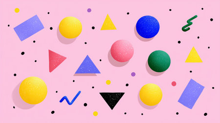 Dynamic layout featuring colorful geometric shapes and playful forms on pink background. Concept for kids education, creative arts, graphic design.