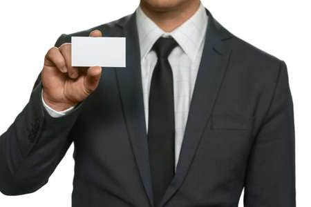 Male hand hold empty visiting contact card presenting information for copy space isolated on white, business