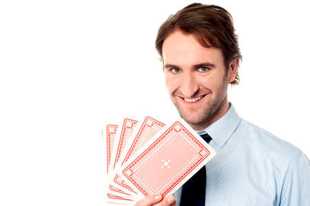 Mid adult man with hand of playing cards playing cards in traditional UK pub