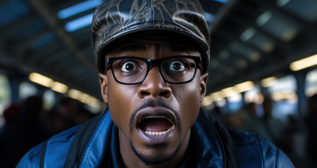 A young man wearing glasses and a hat is standing in a busy train station looking very surprised. There are people in the background wearing colorful clothing, and the station is full of activity.