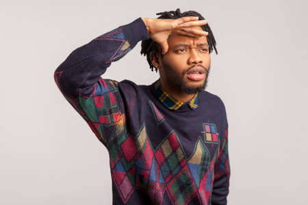 Concentrated african man with dreadlocks holding hand over head looking far away, trying to see future and perspectives. Indoor studio shot isolated on gray background