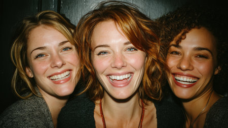 Three women share a joyful moment, close up, bright smiles, warm friendship and happiness.