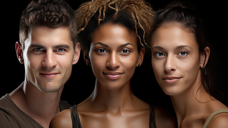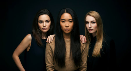 Three individuals share a captivating moment under soft lighting, showing a blend of natural beauty and elegance with an intense gaze. Perfect for creative projects. Generated A.I.