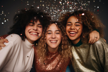 Portrait of a group of young women having fun with confetti isolated over gray background