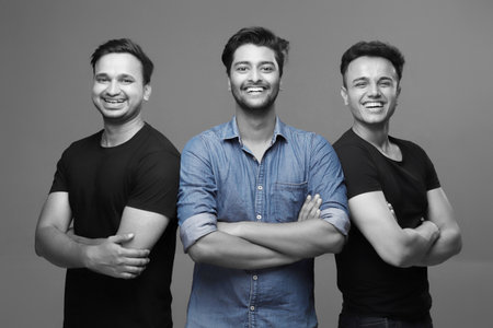 Portrait of three multiethnic men standing with arms crossed on dark background