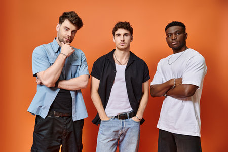 three good looking multicultural friends in casual urban outfits posing together on orange backdrop