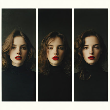 This elegant portrait series features a young woman with dark hair and striking red lips. Set against a dark background, the images convey beauty, confidence, and style.