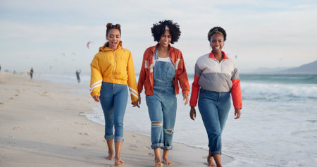 Happy women, walking and holding hands with friends on beach for holiday, weekend or strolling in nature. Young, female person or group with smile for outdoor vacation or social by ocean coast