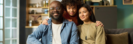 Portrait of middle aged Black man in casual clothing sitting with smiling multiethnic teenager and young adult Caucasian woman at home, all looking at camera, showing family unity
