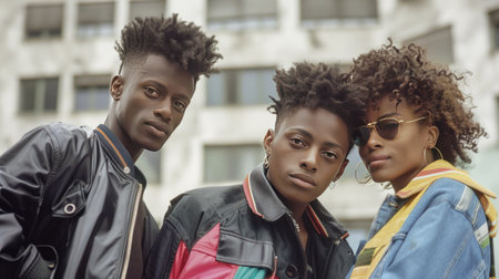 Portrait of group of black young people in retro 90s clothes and haircuts, photo of friends in nineties style, AI generated
