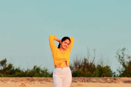Candid and beautiful Attractive young woman in casual wear holding hand in hair and smiling while standing barefoot against grey background : Generative AI