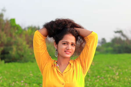 Portrait of a beautiful young Indian woman with long curly hair.