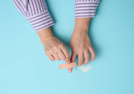 female hand and brown medical adhesive plaster for the treatment of injuries and cuts on the skin, blue background