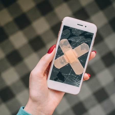 Broken screen with plaster of white smartphone.