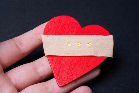 close-up of a wounded heart on with bandage on dark background.. Feelings of love, pain, sorrow. Relationship concept.