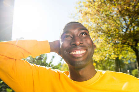 Portrait of young cheerful african-american man in sports clothing who is looking at camera and smiling.