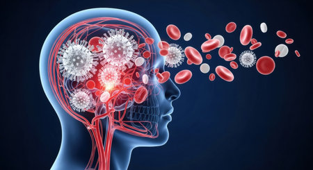 3d render of a human head with a translucent skull showing the brain and blood vessels infected by viruses. Red and white blood cells are also visible.