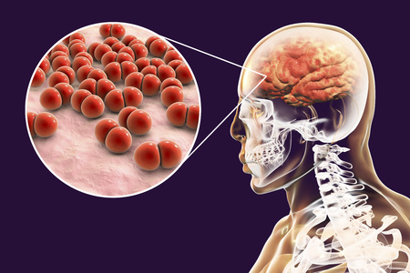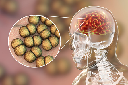 Brain infection with Neisseria meningitidis bacteria, 3D illustration. Gram-negative diplococci that cause meningitis and encephalitis