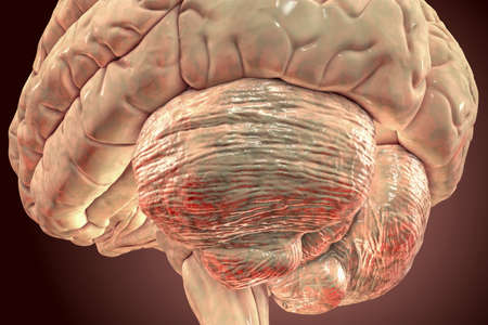 Human brain with close-up view of cerebellum, 3D illustration. It plays an important role in motor control and is involved in some cognitive functions, attention, language, emotional control