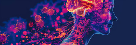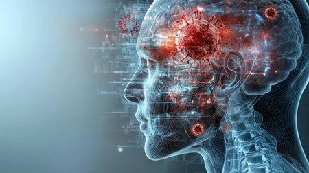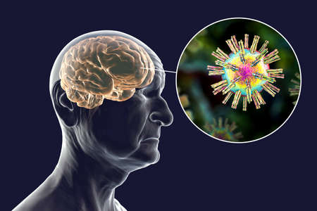 A digital rendering illustrates a human head with a glowing brain, highlighting neurons and virus particles.
