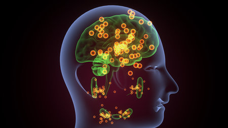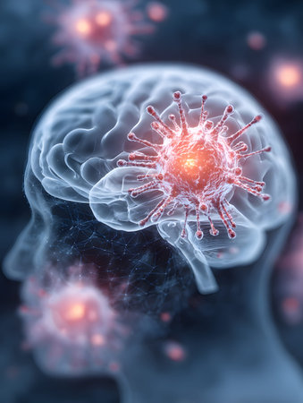A digitally rendered brain illustration with virus-like particles, potentially representing disease or infection.