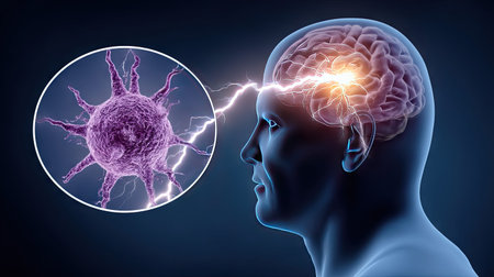 This digital illustration depicts the human brain with a focus on neuron activation and electrical impulses, symbolizing the complexity of neural science and mental processes.