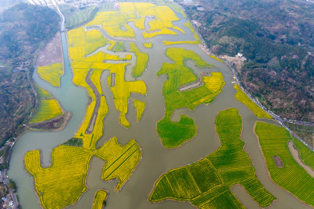 Aerial view of rape fields in Taojiang Prefecture, Taizhou, China.