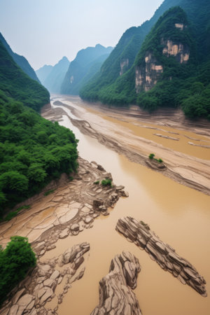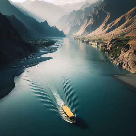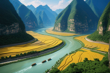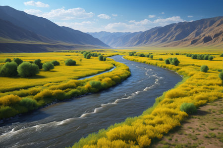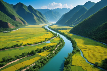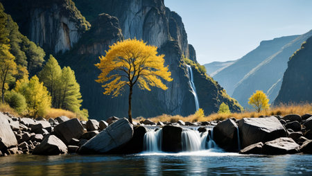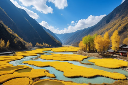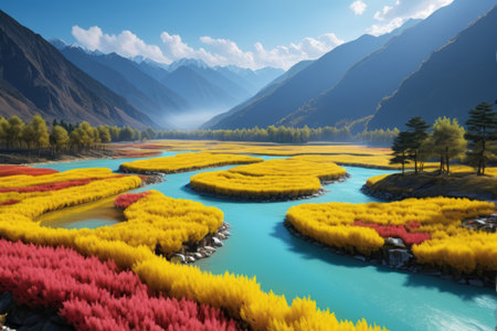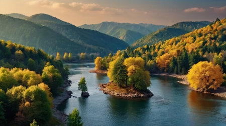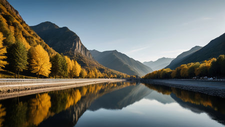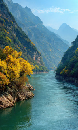 This image showcases a river winding through a valley flanked by towering mountains. The scene features vibrant autumn foliage with touches of yellow and green. The composition is bright with natural sunlight, suggesting an outdoor setting suitable for various editorial and commercial applications.