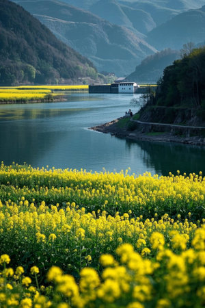 A picturesque scene of a tranquil lake with a traditional pavilion surrounded by vibrant yellow rapeseed flowers. The image evokes peace and serenity.