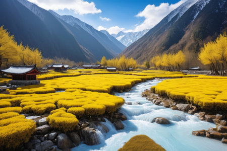 Colorful flower fields and mountain landscapes on both sides of the river valley