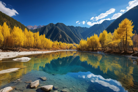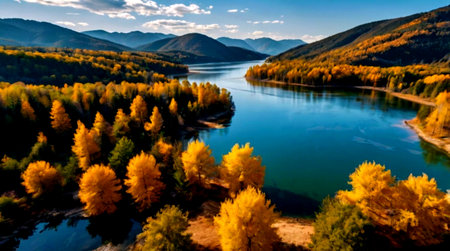 Reflecting landscape of golden trees among autumn mountains and rivers