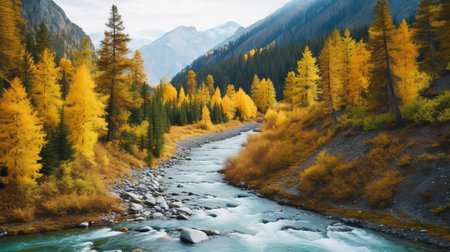 Beautiful autumn landscape with a mountain river and yellow larch trees