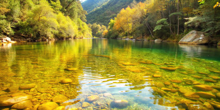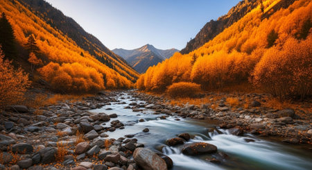 Crystal-clear mountain river winding through the Truso Gorge in Georgia during autumn. Bright foliage, sunlit hills and untouched nature create a serene mountain scene