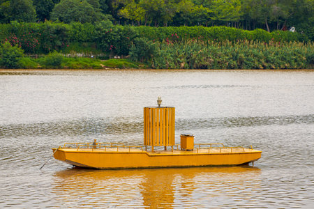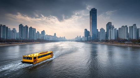 A vibrant yellow ferry sails along a serene river surrounded by impressive skyscrapers under a moody sky, showcasing a dynamic urban landscape and tranquil waters.