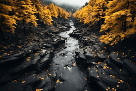 Winding river flows through vibrant autumn landscape showcasing bright yellow foliage