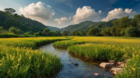 This stunning landscape features a clear river reflecting the blue sky, surrounded by lush fields and mountains, creating a tranquil rural atmosphere perfect for nature lovers.