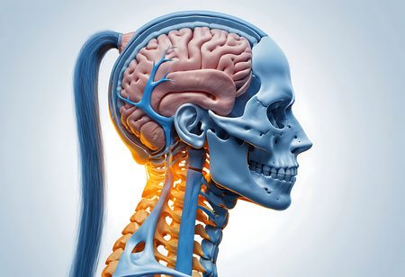 Detailed anatomical illustration showing the human brain, spine, and nervous system with a focus on the intricate connections between them