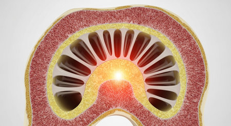 Detailed cross-section of a human kidney showing internal structure with a glowing center on white background