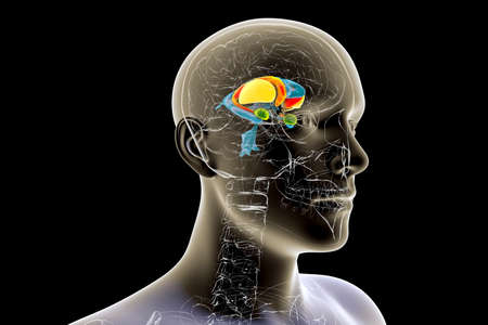 Brain dorsal striatum anatomy, 3D illustration. The dorsal striatum consists of the caudate nucleus (orange) and the putamen (yellow). Lateral ventricle is colored blue, amygdala is green