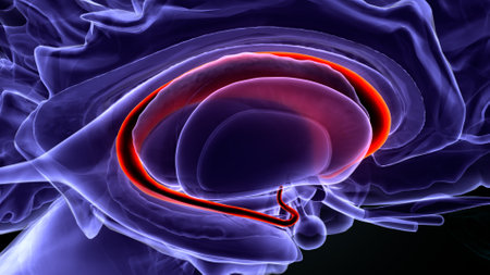 An image of a sagittal section of the human brain labeled with region names in 3D