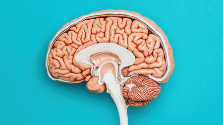 This vibrant image showcases an anatomical model of the human brain, providing a clear view of its intricate structures and components. Ideal for educational and scientific purposes.