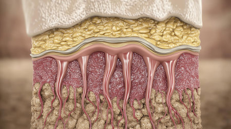 A detailed cross-section of human skin layers reveals cellular structures, fibers, and interconnected networks with glowing highlights.